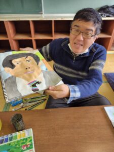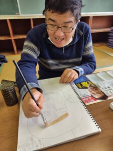 お面の色付けが完成すると、自分の作品を絵にしているSさん😍