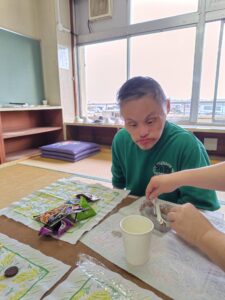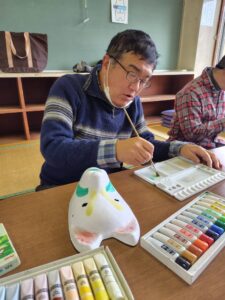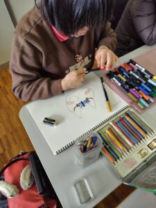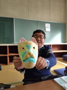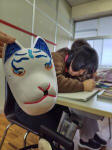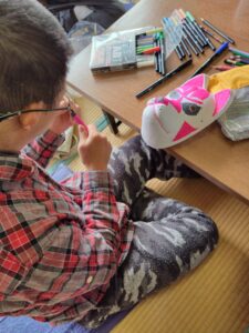 先月の楽がきクラブの投稿を見て『お面の色付けお願いしようかな~🤔』と連絡をいただき、今日みんなに色付けをしてもらいました。