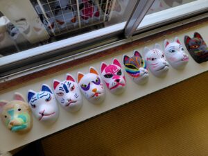 地域の誰でもが自由に集い、過ごせる場所として開放しています。神社の社殿にきつねのお面が展示されていて、開放日には見学ができるようになっています。